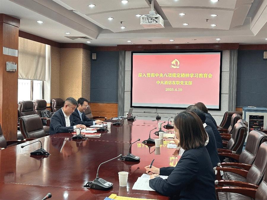 为深入贯彻落实党的关于全面从严治党的重要部署,切实将中央八项规定精神转化为酒店高质量发展的行动指南,中大酒店公司按照资产公司党委要求,于4月10日上午在职党支部全体党员召开深入贯彻中央八项规定精神学习教育会,系统学习中央八项规定精神,部署落实举措,明确各阶段性任务目标。